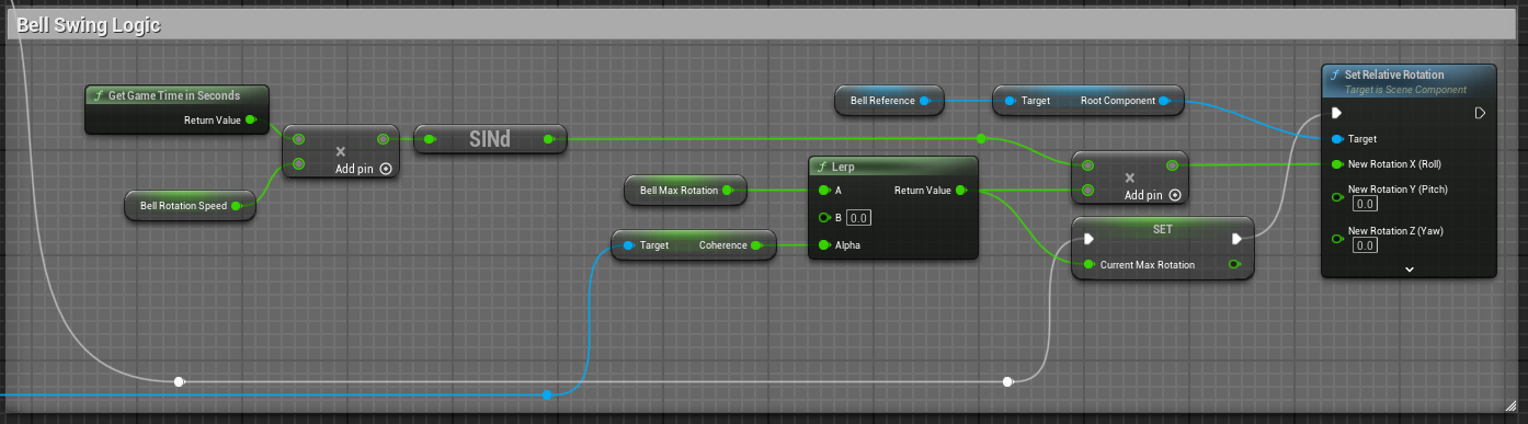 To create a realistic swinging effect for the bell, I used a sine wave to simulate the oscillation and a lerp node to control its amplitude, with coherence as the alpha. When coherence is high (> 0.7), the bell slows down and eventually stops. As coherence drops, the Lerp gets closer to the bell's max rotation, making the swing higher and more intense. This is much simpler than my original method of using an animation timeline and allows for easier control of amplitude and a gradual slow down at high coherence.
